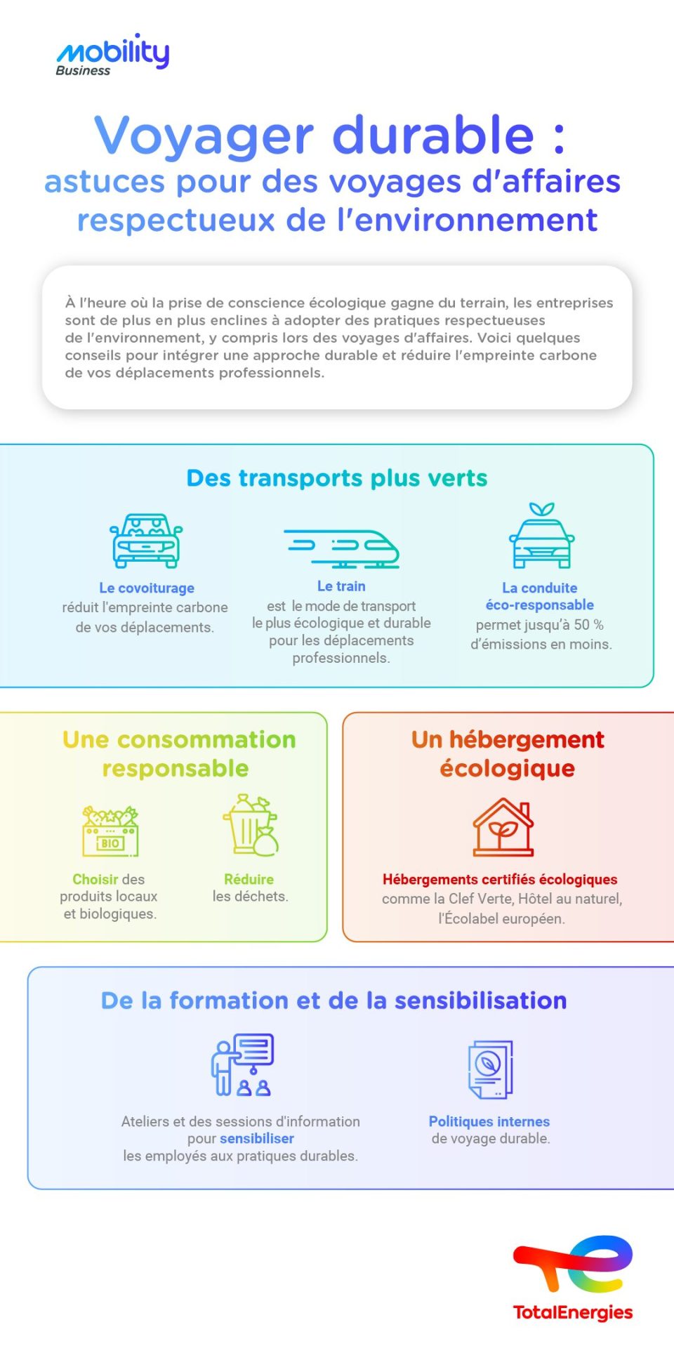 • Politiques internes : établissez des politiques de voyage durable, incluant des directives sur les modes de transport privilégiés, les choix d’hébergement et les comportements responsables à adopter.