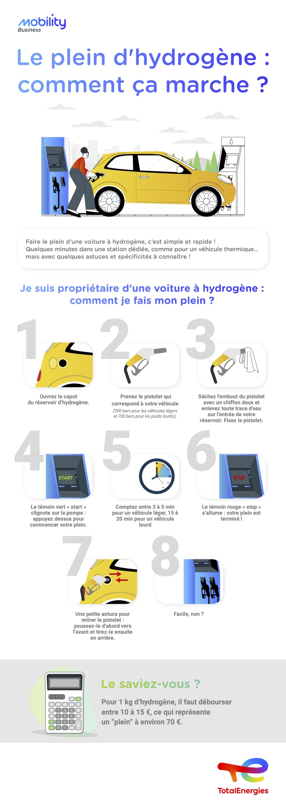 Pour faire le plein d’une voiture à hydrogène, oubliez la recharge électrique habituelle. Elle se ravitaille comme les voitures thermiques et hybrides, non pas avec un câble, mais à une station à hydrogène ! En quelques minutes, elle est pleinement rechargée, prête à rouler et à n'émettre que de la vapeur d'eau ! Le saviez-vous ? Pour 1 kg d’hydrogène, il faut débourser entre 10 à 15 €, ce qui représente un “plein” à environ 70 €.